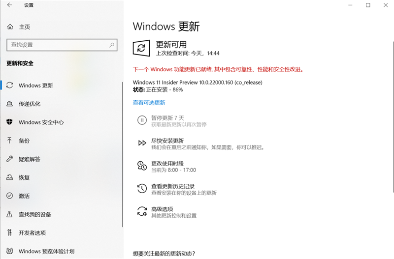 选择后点击Windows更新,就会收到最新的Windows 11推送了。下载过程有点长,可以忙其他的去了。