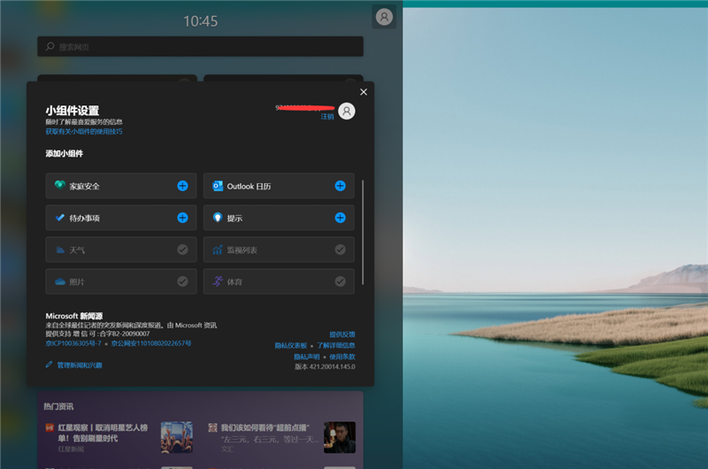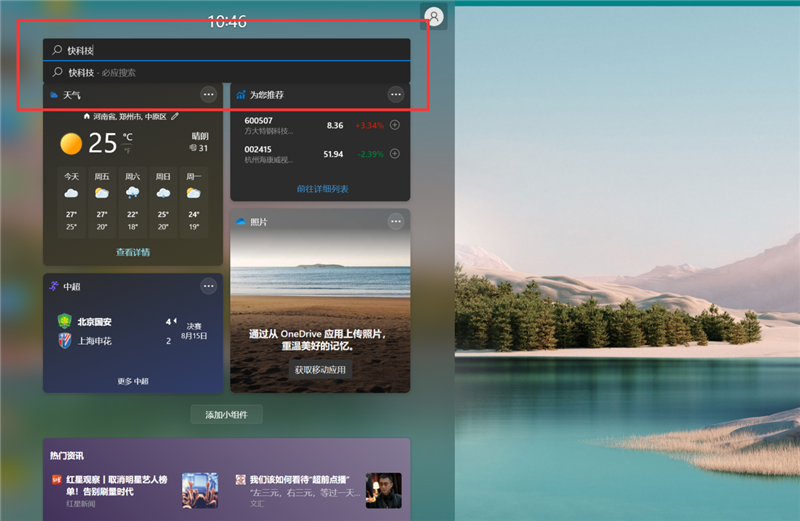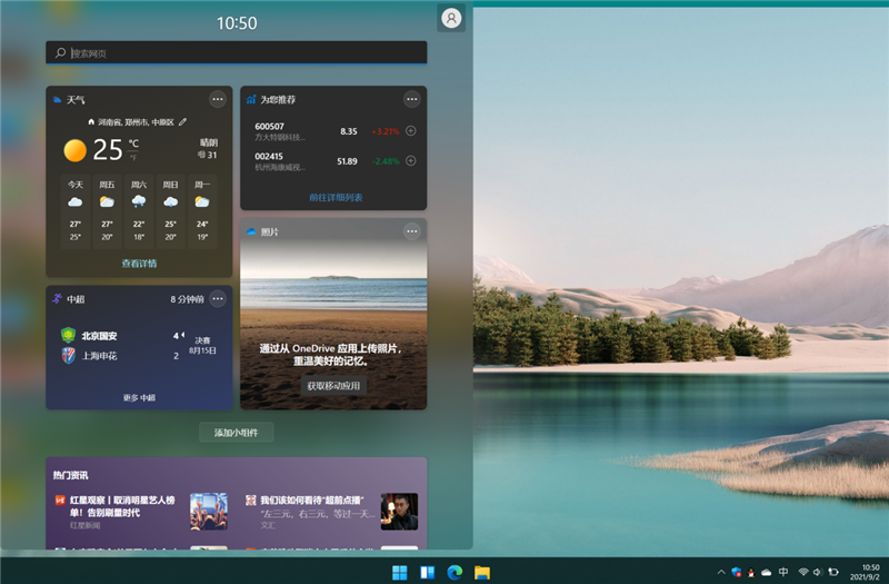 微软在系统图标旁边添加了一个小组件按钮,打开后类似于新闻收纳空间,目前能体验的到的功能有“新闻和兴趣”,但数量还很少,看来得等正式发布后开发者们跟上。