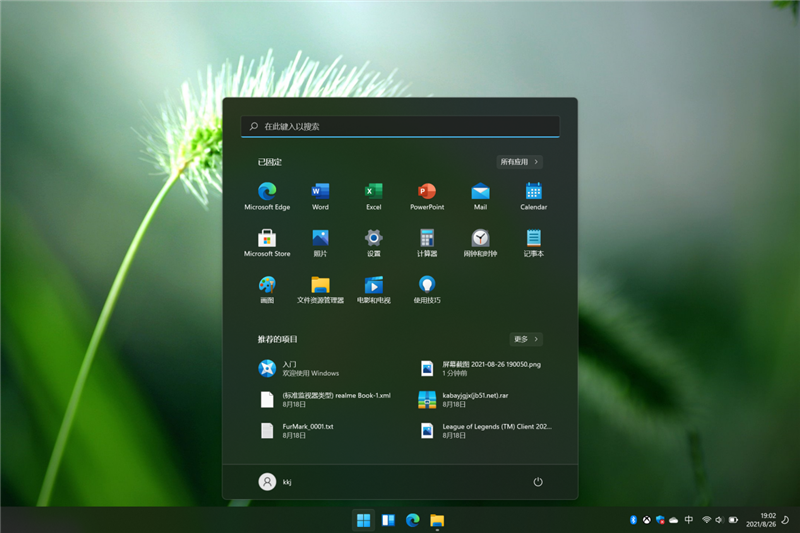Windows 11升级完成后,开机第一画面如图所示,熟悉的开始菜单被放到了状态栏中间,整体风格更加圆润。