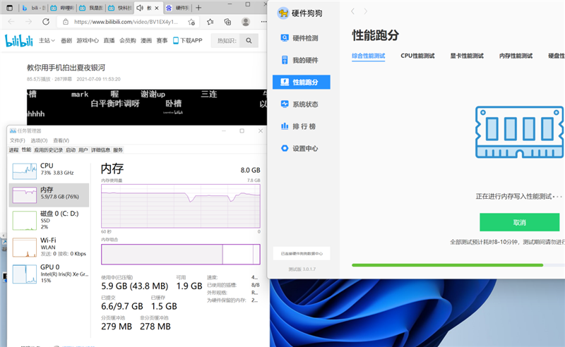 打开硬件狗狗测试内存写入、单开网页播放视频,内存占用飙升至6GB左右,有意思的是即便是测试内存读写,系统始终留出来了2GB左右的空闲内存。