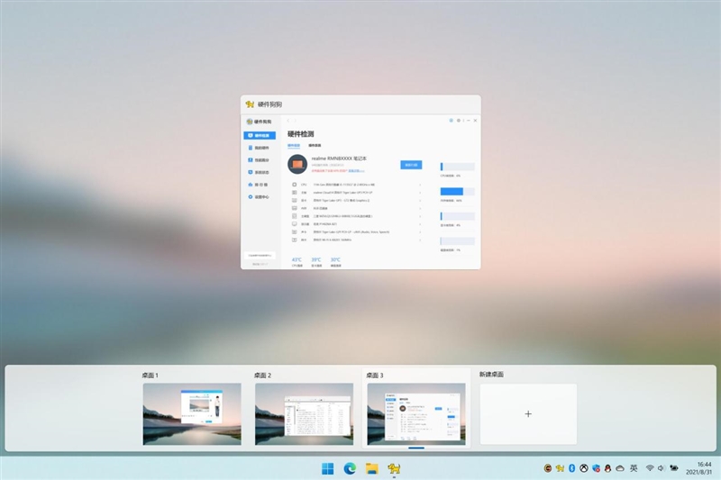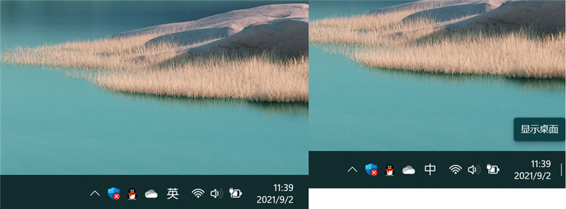 右下角单击显示桌面功能被保留下来,只不过和Windows 10不同的是,Windows 11抢鲜版的显示桌面按钮是隐藏式的,鼠标放上去1秒左右就会显示提示语,不过平时使用直接点击即可。