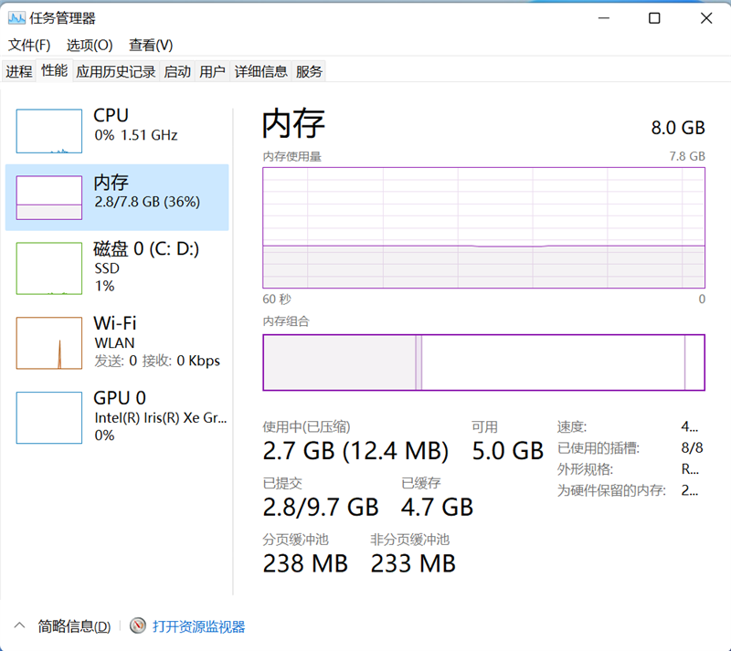 系统资源占用方面,开机3分钟,未打开任何程序,8GB内存内存占用了2.7GB。