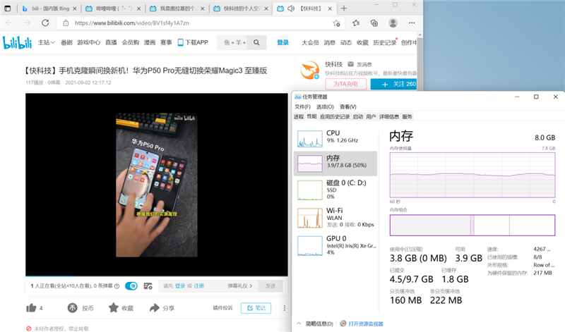 单开浏览器播放视频,内存占用接近4GB。