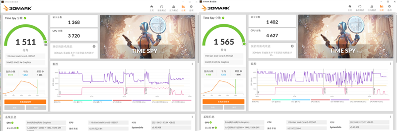 在Windows 10系统下,锐炬Xe的3DMark Time Spy得分为1511分,Windows 11下锐炬Xe的3DMark Time Spy得分为1565分差距在3%左右,几乎可以忽略不计。