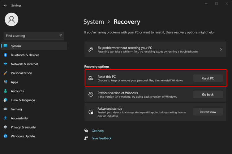 - 从左侧窗格中,选择System,然后从右侧导航到Recovery。