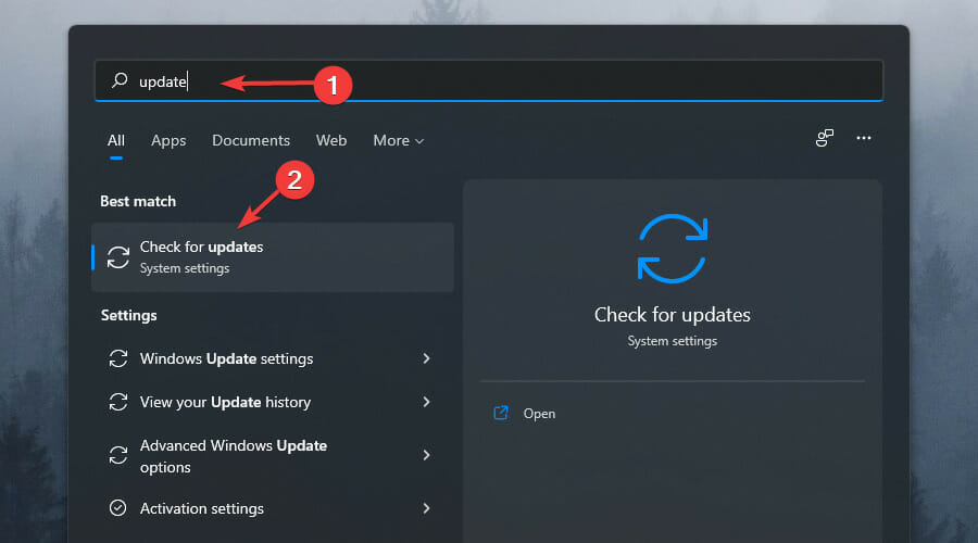 - 键入更新并单击检查更新选项。