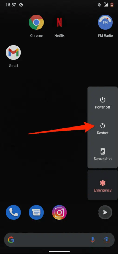 - 按住电源按钮几秒钟,然后在手机上按重新启动。