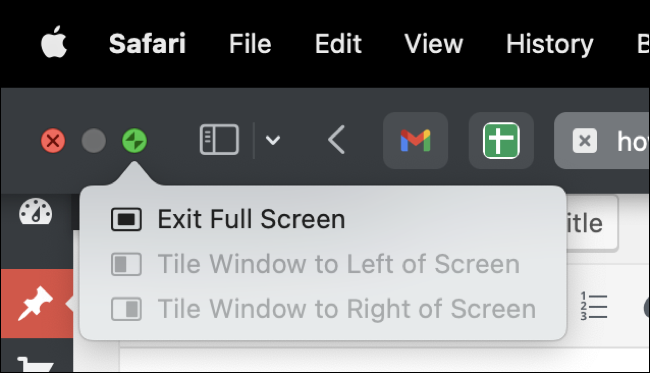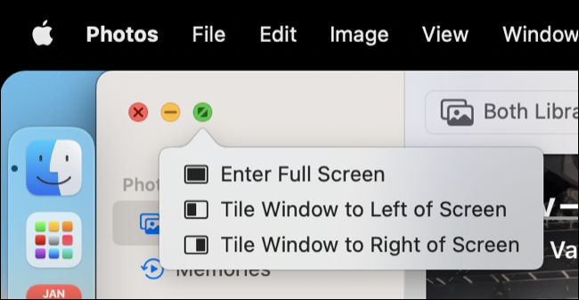要访问分屏浏览,请将鼠标悬停在窗口顶部的绿色“全屏”按钮上,直到您看到三个选项显示。选择“将窗口平铺到屏幕左侧/右侧”以触发拆分视图。您将进入全屏模式,您将在屏幕的另一侧看到当前打开的窗口列表,您可以单击这些窗口以平铺到显示器的另一侧。