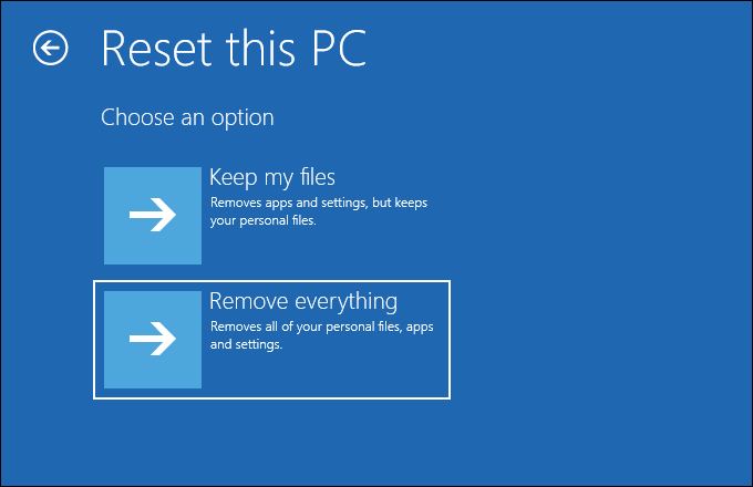 您现在可以选择“保留我的文件”,但要进行全新重新安装,请选择第二个选项“删除所有内容”。这将删除所有文件、已安装的应用程序和以前更改的设置。