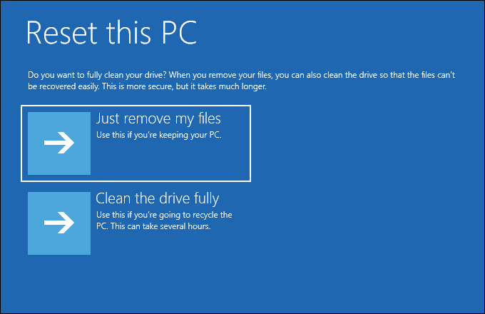 倒数第二步是决定是否要“完全清洁驱动器”。如果您打算在全新安装后将PC出售或交给其他人,这是最佳选择。如果没有,选择“仅删除我的文件”就足够了。