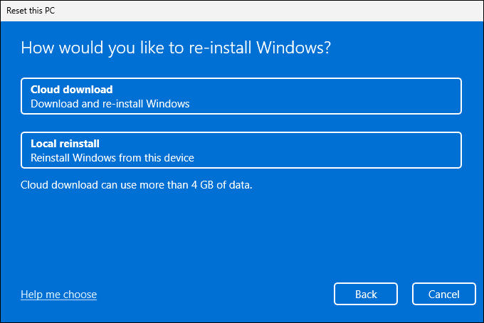 此处有两个选项可用于重新安装 Windows 11。本地重新安装会重用计算机上已有的原始 Windows 11 安装文件。云下载将从微软服务器获取所需的安装文件。选择每种方法各有利弊。