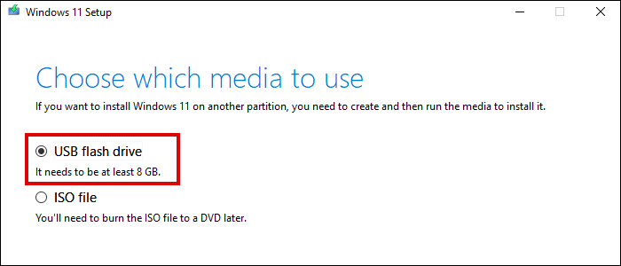 - 选择“USB闪存驱动器”选项,让它将Windows 11写入8GB或更大的驱动器。