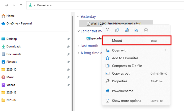 打开文件资源管理器并导航到 ISO 文件的下载位置。右键单击该文件,然后从上下文菜单中选择“装载”。