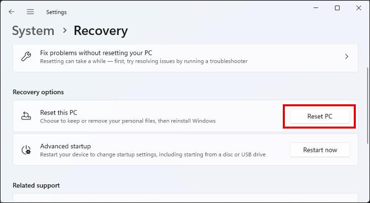 导航到“系统>恢复”>设置,然后查找“恢复选项”部分。单击“重置PC”按钮开始重新安装过程。