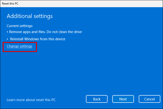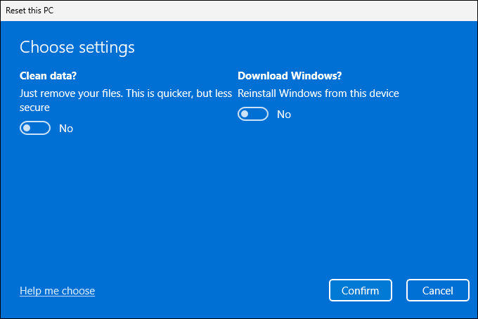 - 如果启用了“清理数据”,将更安全地擦除驱动器。这可能需要很长时间,但在重置您计划出售或赠送的设备时很有用。