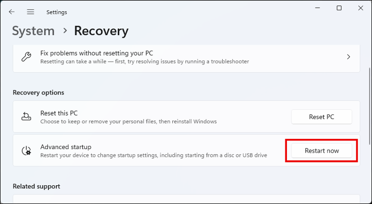 访问菜单的最简单方法是通过“设置>恢复”。在“恢复选项”标题下,单击“高级启动”旁边的“立即重新启动”按钮。你的电脑应直接重新启动到 WinRE 菜单中。