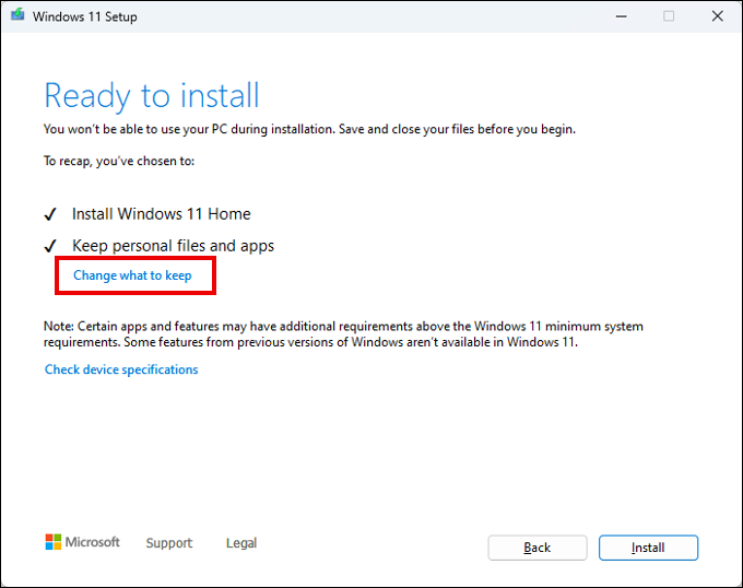 按照设置步骤操作,直到到达“准备安装”屏幕。在这里,单击“更改要保留的内容”,然后选择“无”。