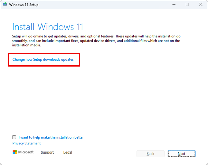 默认情况下,Windows 11 安装程序将联机以获取更新、驱动程序和一些可选功能。这可以帮助重新安装更顺利,但需要更长的时间。如果要将添加更新等推迟到安装操作系统后,请单击“更改安装程序下载更新的方式”,然后选择“现在不”。