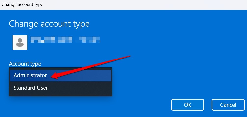 - 在“帐户类型”下选择“管理员”,然后单击“确定”。