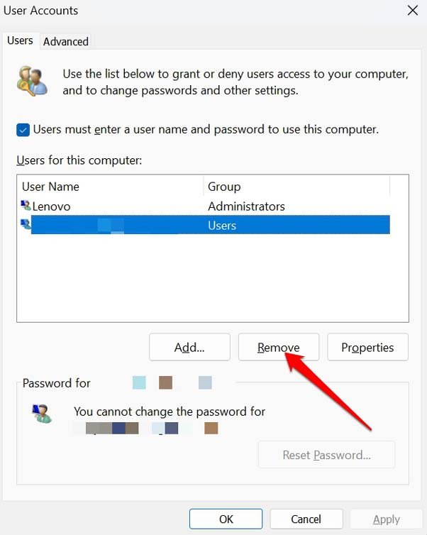 此方法将允许您在其他选项不方便时从计算机中删除 Microsoft 帐户。只需进入用户帐户选项卡并删除帐户,如下所示: