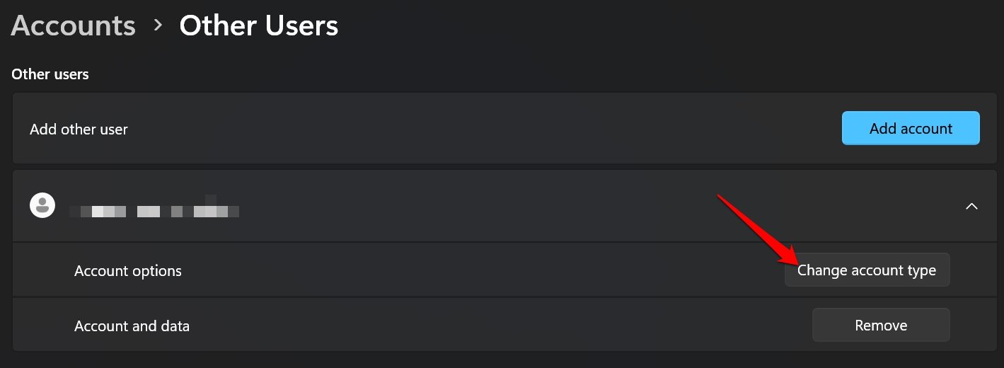 - 选择帐户所有者名称>然后单击更改帐户类型。
