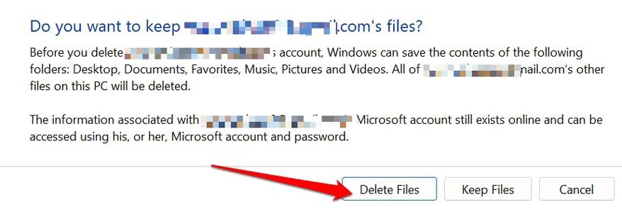 第 5 步:在下一个窗口中,系统将提示你是否要维护 Microsoft 帐户的配置文件文件夹。单击“删除文件”按钮,如果不需要它。