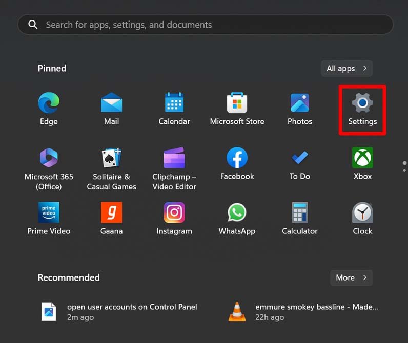 第 1 步:转到“开始”菜单,然后选择“设置”。