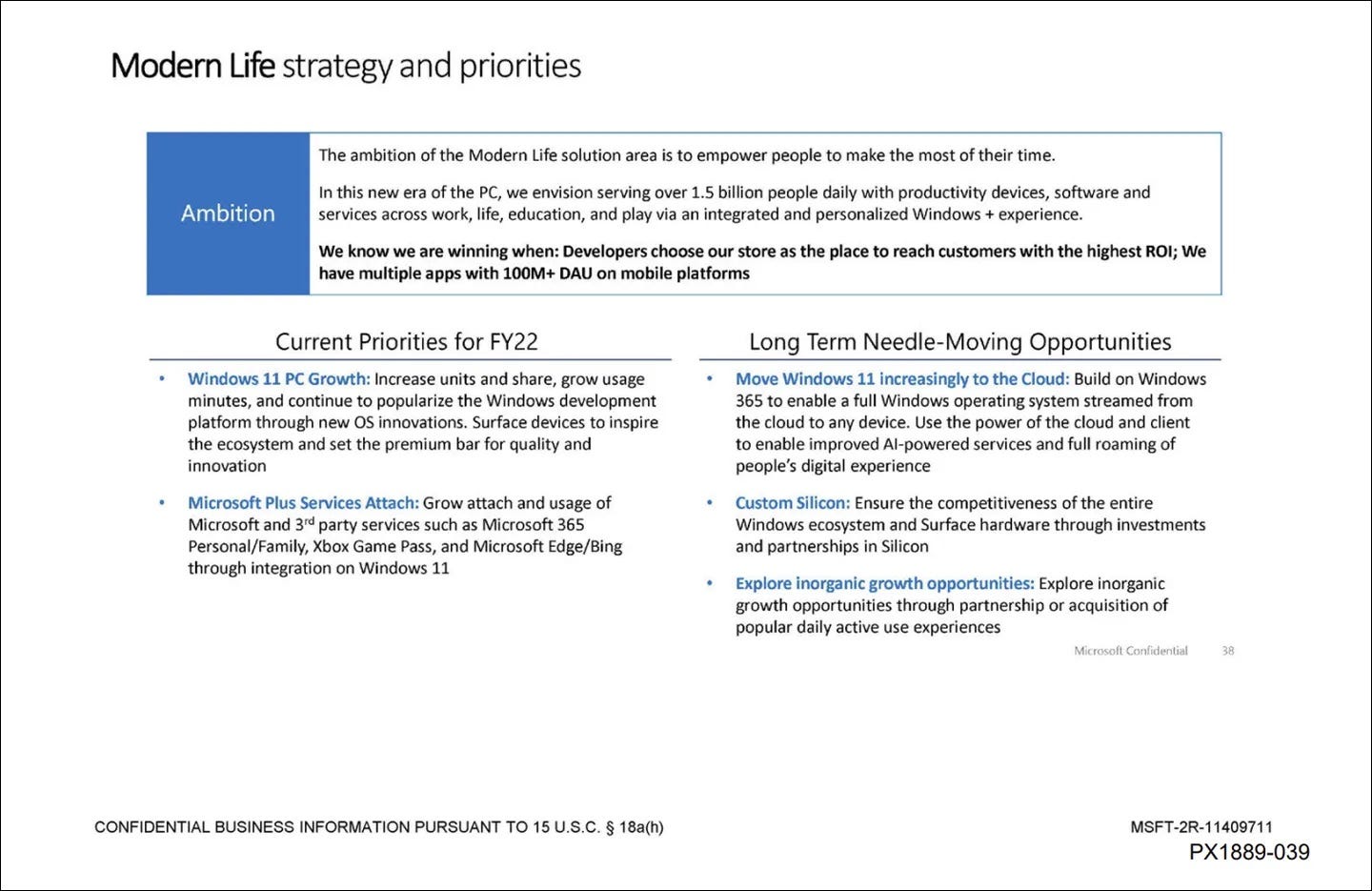Microsoft透露了关于其“业务状况”的内部演示文稿,其中包含一张关于公司“现代生活战略和优先事项”的幻灯片。其中大部分是关于你所期望的 – Microsoft正试图发展Windows 11,将更多用户转换为其付费服务,并为其Surface设备开发定制芯片。不过,有一个部分引起了一些关注,它概述了基于云的Windows产品的计划。