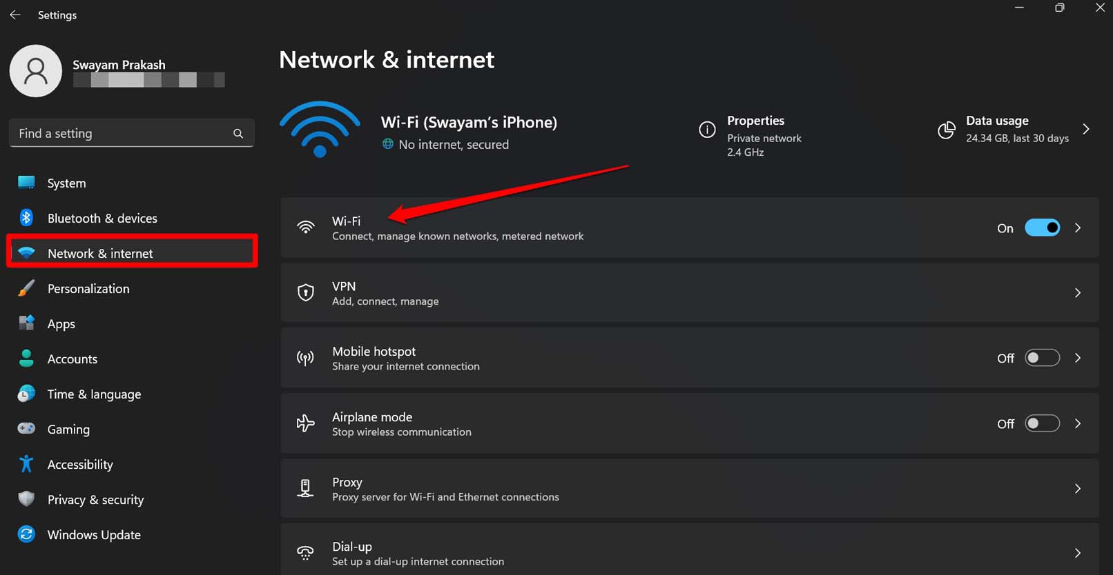 - 单击左侧面板上的网络和互联网。