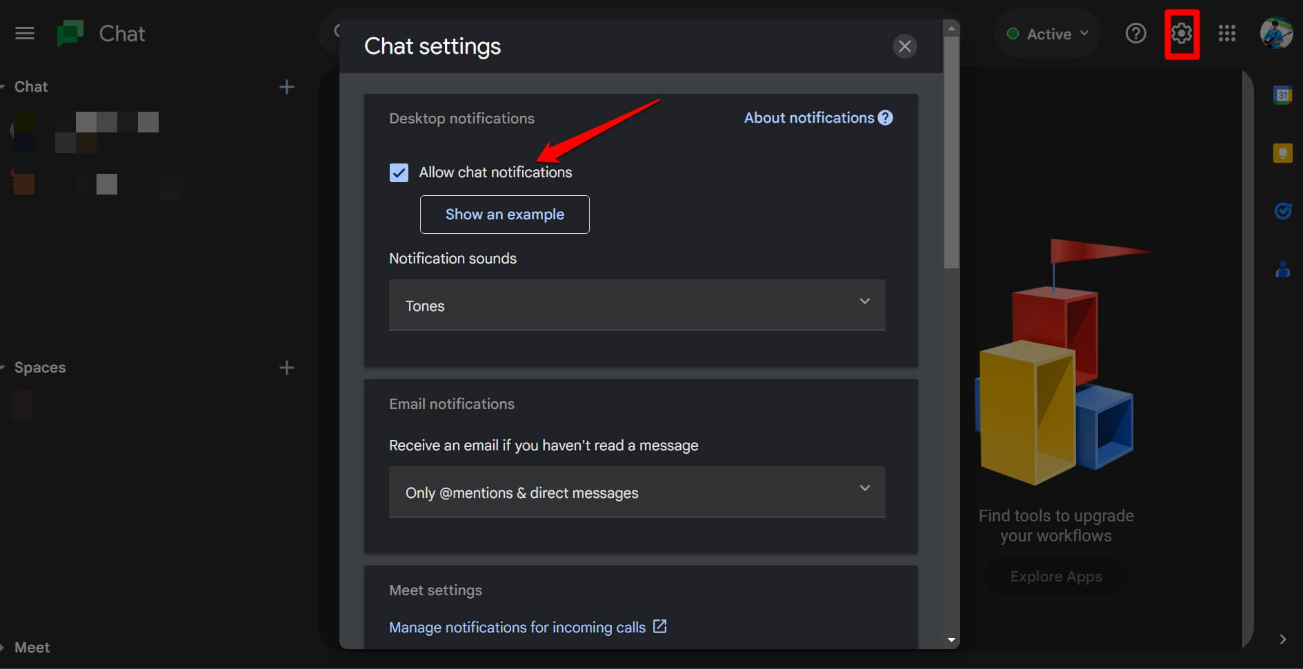 如果您没有收到任何消息,请检查 Google 聊天设置中是否启用了聊天通知。