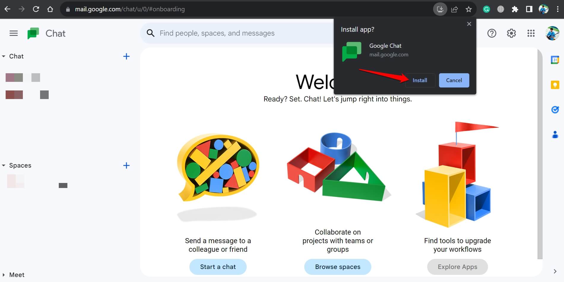 - 要在 Windows 11 上安装 Google Chat,请使用浏览器转到 chat.google.com