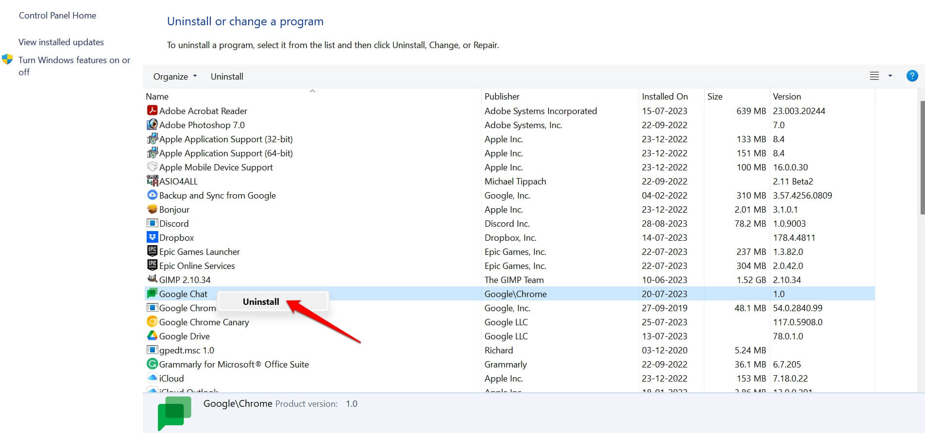 - 然后滚动到谷歌聊天并右键单击它。选择卸载。