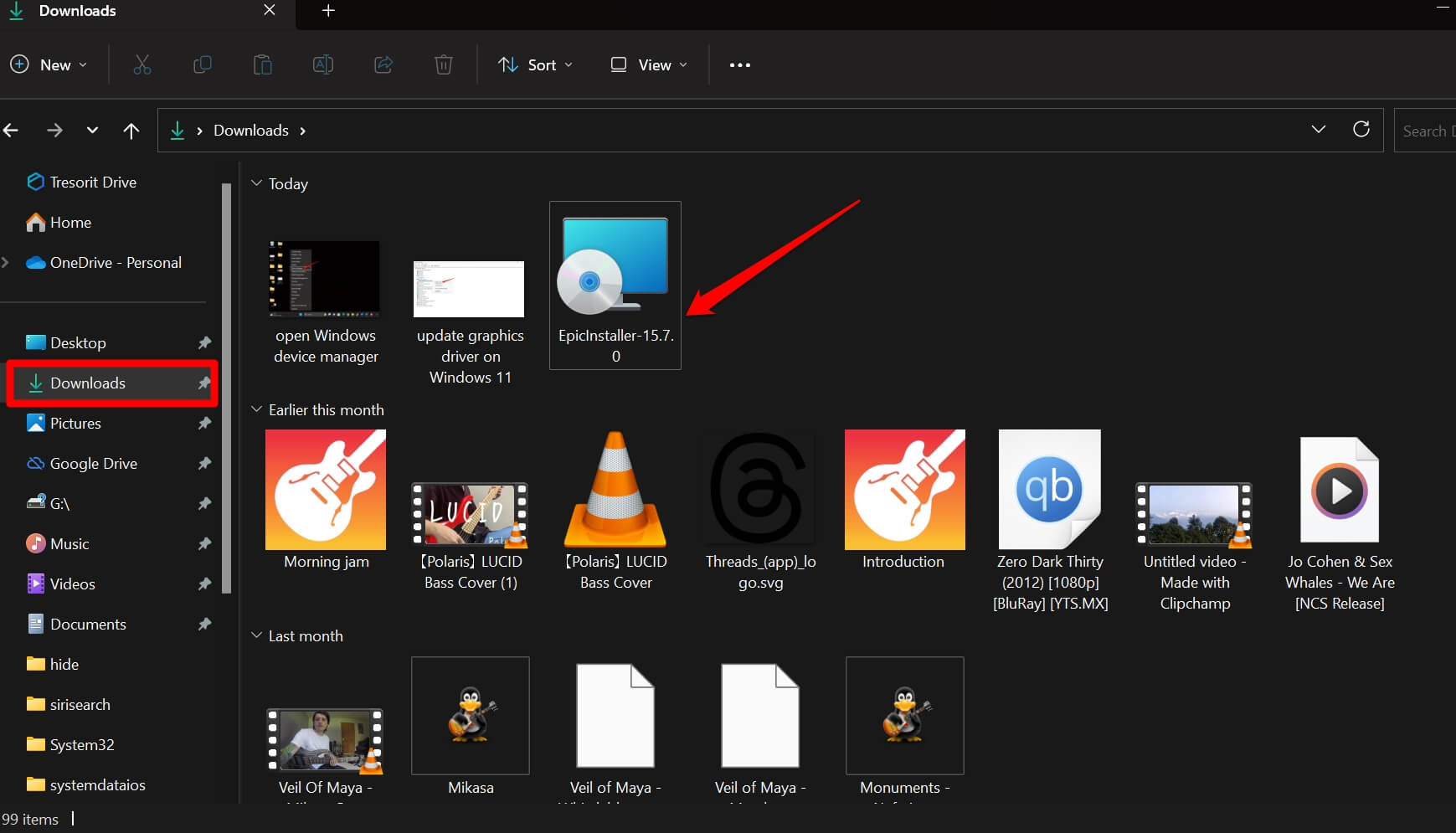- 转到“下载”文件夹并浏览文件以访问 Epic Games 安装程序。