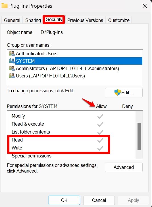 - 在“权限”选项卡下,确保“读取”和“写入”在“允许”下有一个复选标记。