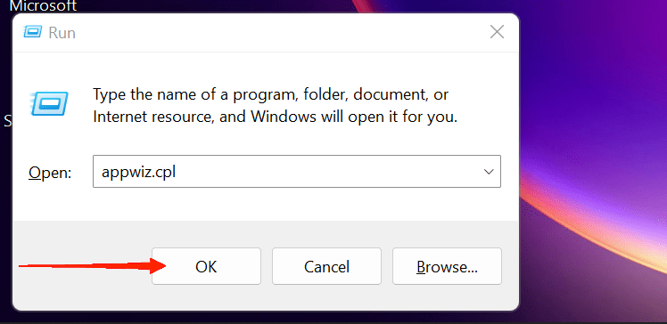 - 现在,键入 appwiz.cpl 然后点击 OK 按钮。