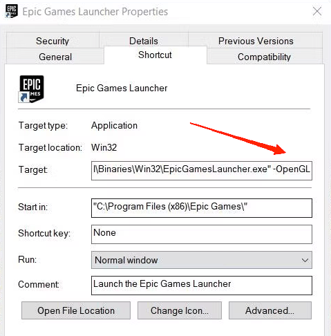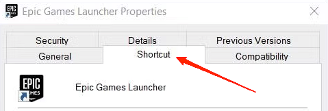 - 在桌面上找到 Epic Games 启动器快捷方式图标,单击鼠标右键,然后转到属性。转到快捷方式选项卡。