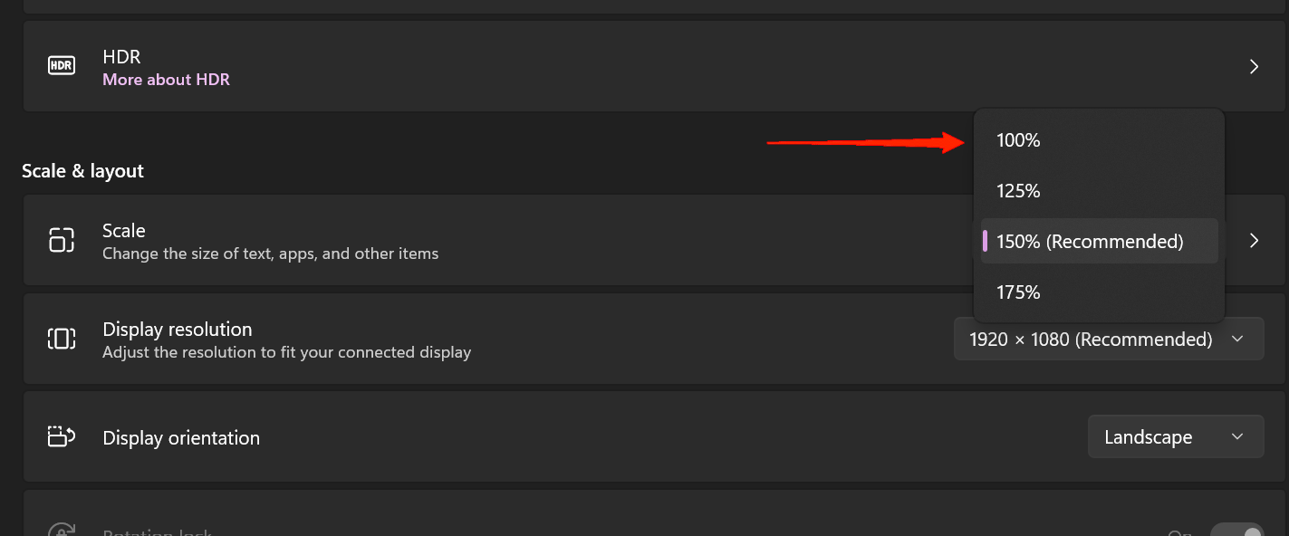 - 现在,找到缩放选项并打开下拉菜单并选择 100% 从选项中。