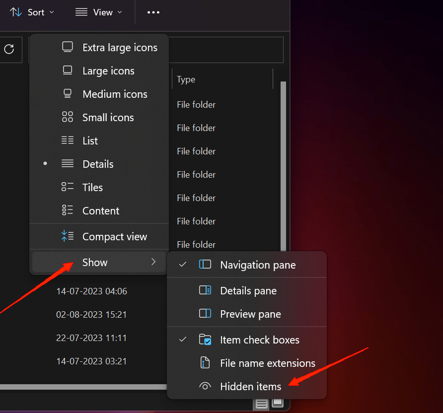 - 单击“查看”选项卡,将鼠标悬停在“显示”上,并确保启用“隐藏”选项以查看所有隐藏的文件和文件夹。