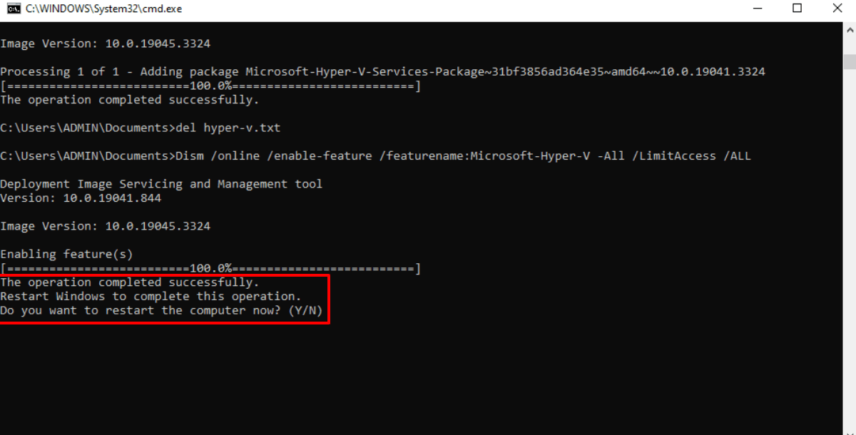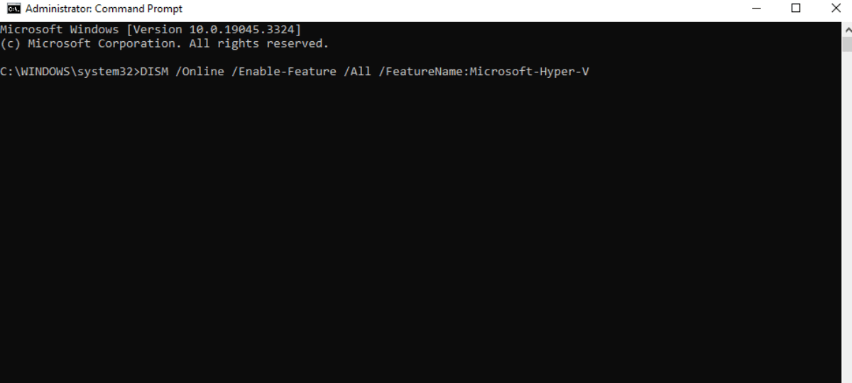 - 在随后的窗口中,输入提供的命令并按 Enter 键。这将提示Windows在Windows 11上启动Hyper-V安装过程。