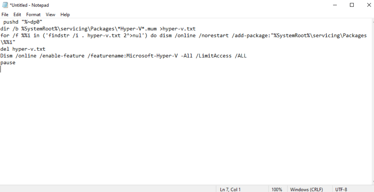 pushd "%~dp0" dir /b %SystemRoot%\servicing\Packages\*Hyper-V*.mum >hyper-v.txt for /f %%i in ('findstr /i . hyper-v.txt 2^>nul') do dism /online /norestart /add-package:"%SystemRoot%\servicing\Packages\%%i" del hyper-v.txt Dism /online /enable-feature /featurename:Microsoft-Hyper-V -All /LimitAccess /ALL Pause