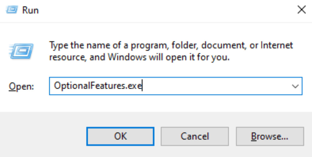 - 按 Win + R 打开“运行”对话框,输入“可选功能.exe”,然后按 Enter。 或者,您可以在搜索框中键入“Windows 功能”,然后从最佳匹配结果中选择“打开或关闭 Windows 功能”。