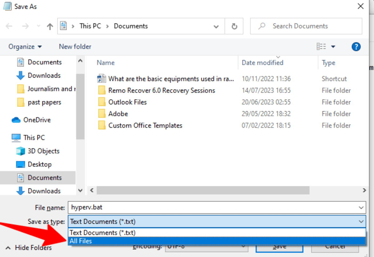 - 在文件名字段中,输入 hyperv.bat。在文件名末尾包含.bat扩展名以执行脚本至关重要。