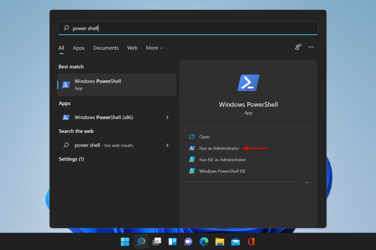 - 单击“搜索”图标,键入power shell,然后单击“以管理员身份运行”以启动它。