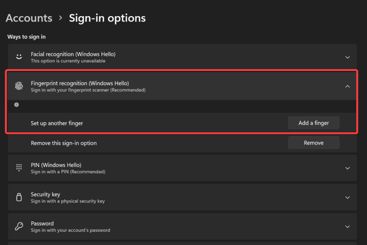 - 展开指纹识别,查看设置另一个手指部分,然后单击添加手指按钮。
