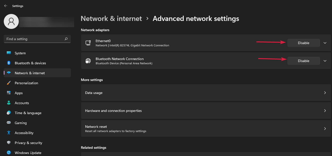 例如,有是在Windows 11中的新功能,您可以通过访问禁用网络适配器高级网络设置从网络和Internet菜单中的设置。