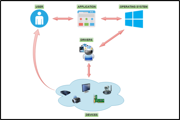 在下图中,您可以查看驱动程序如何在您的 PC 上工作。如您所见,驱动程序是与您的设备相关的软件组件,它允许您的操作系统启动、使用和控制所有硬件和软件部分。