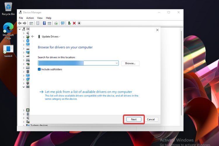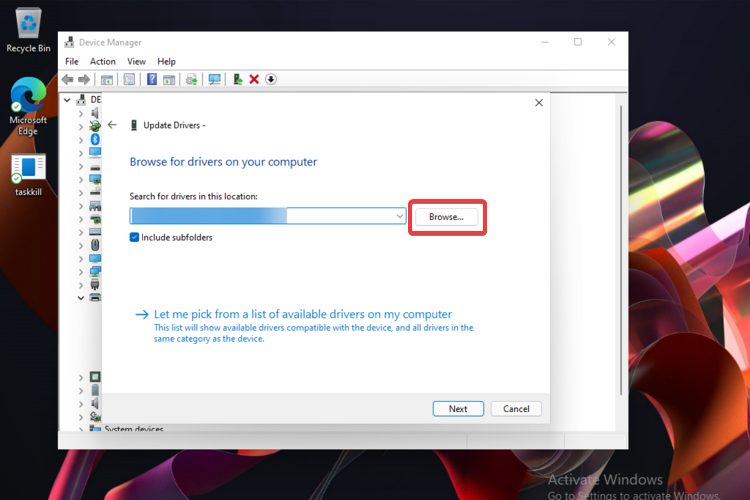 - 单击“浏览”按钮,然后为您的驱动程序选择一个位置。