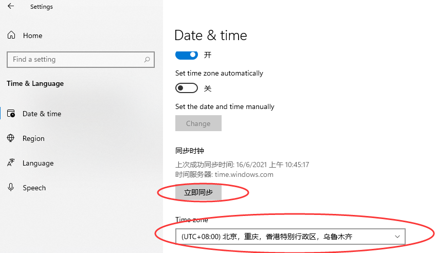 时间可以设置同步时间,时区就是UTC+08:00 这个就是北京时间。