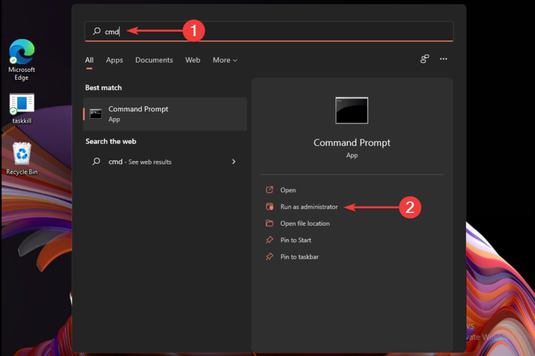 - 按Windows键,然后键入cmd,然后选择以管理员身份运行。