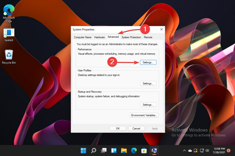 - 选择Advanced选项卡,然后查看Performance部分,然后选择Settings。